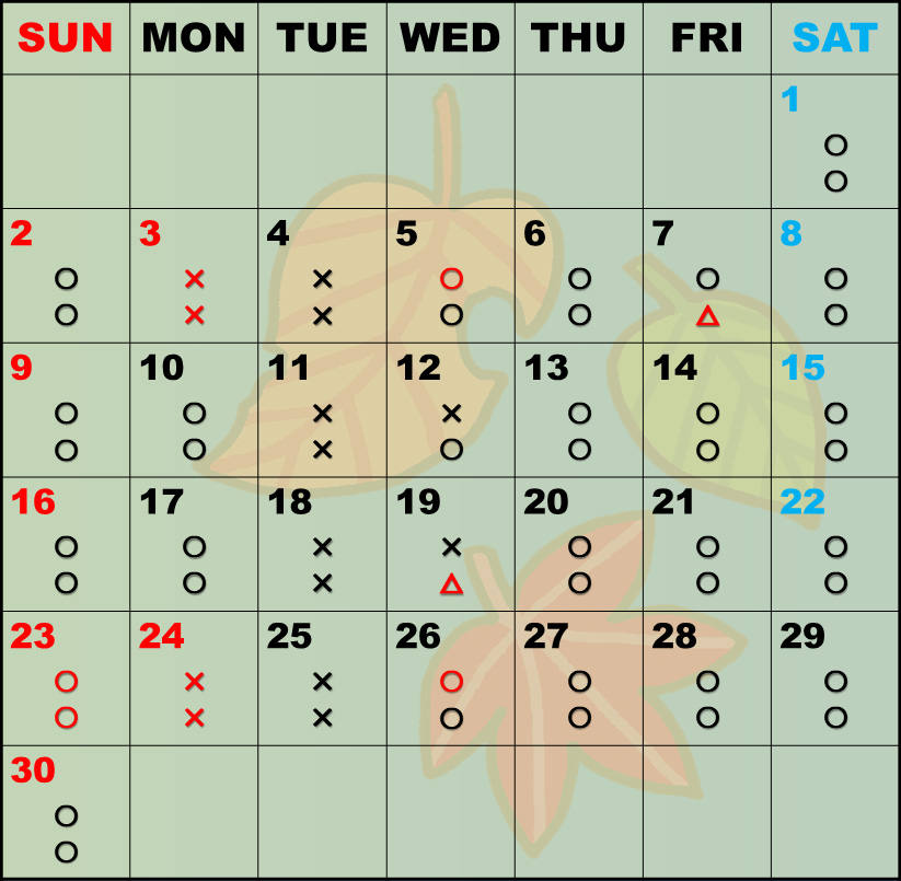 11/23(日)勤労感謝の日は祝日ですが、通常の日曜日通りに診療となります。11/24(月)振替休日は休診となり、 11/26(水)は午前より診療となります。